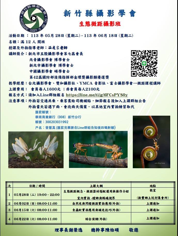 我們特別邀請雙北地區遠近馳名的微距老師-温慶宗老師,百忙當中來新竹幫我們開一系列的課程,從零基礎生態微距攝影的概念,器材的使用,室內的拍攝練習到戶外的外拍,一步一步的帶領我們探索奇妙的生態微距攝影旅程,心動不如馬上行動,趕緊手刀報名參加吧!