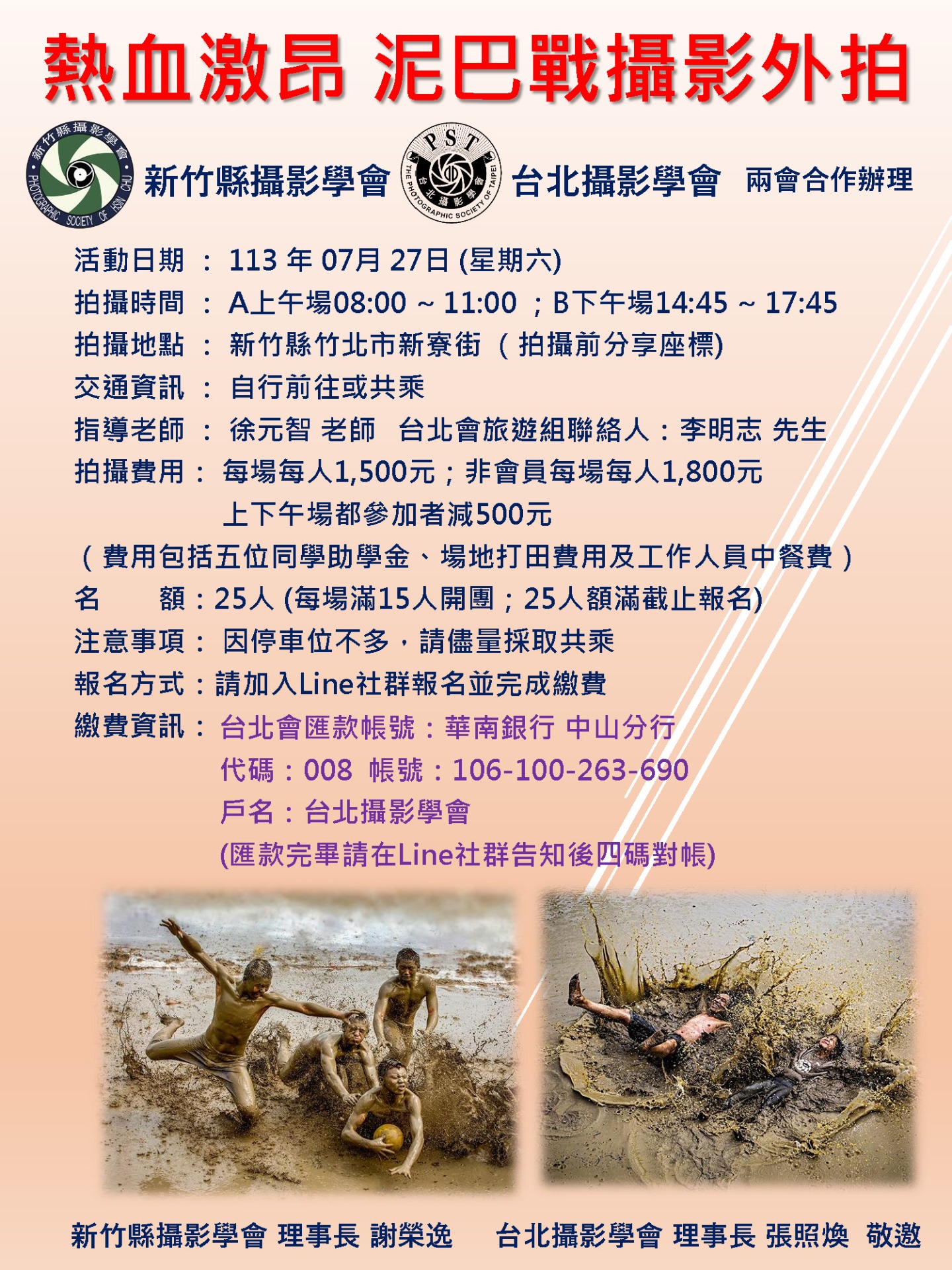 本會與台北攝影學會合作辦理的泥巴戰外拍活動,將於7月27日舉行,分成上下午各一場,期待同好們熱情報名參與!